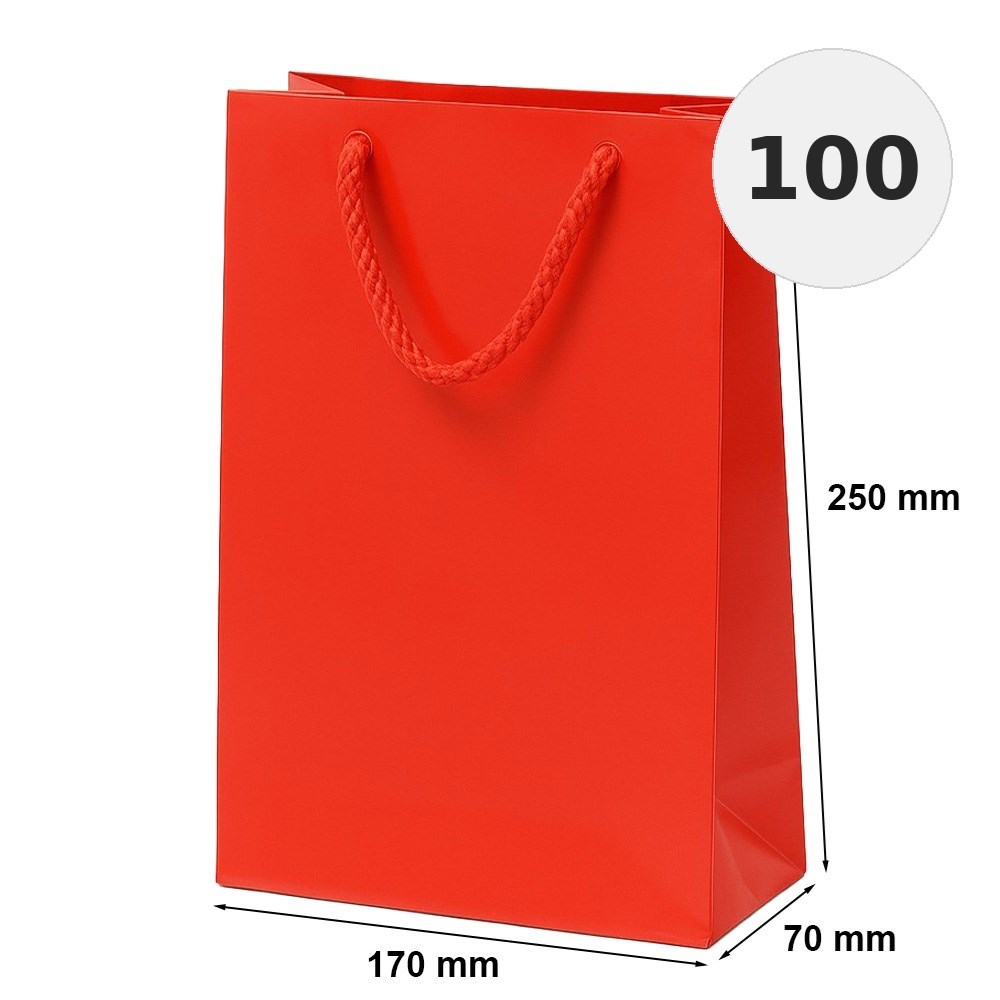 Torba laminowana w kolorze czerwony o wymiarach 170×70×250 mm przeznaczona do pakowania produktów, materiałów firmowych oraz zestawów prezentowych.