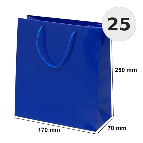 Torba laminowana w kolorze granatowy o wymiarach 170×70×250 mm przeznaczona do pakowania produktów, materiałów firmowych oraz zestawów prezentowych.