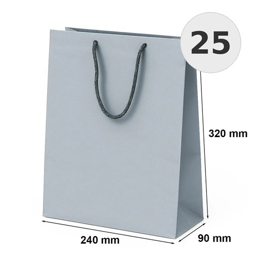 Torby laminowane Prestige w kolorze srebrnym o wymiarach 240x90x320 mm to trwałe opakowanie do pakowania produktów oraz upominków.