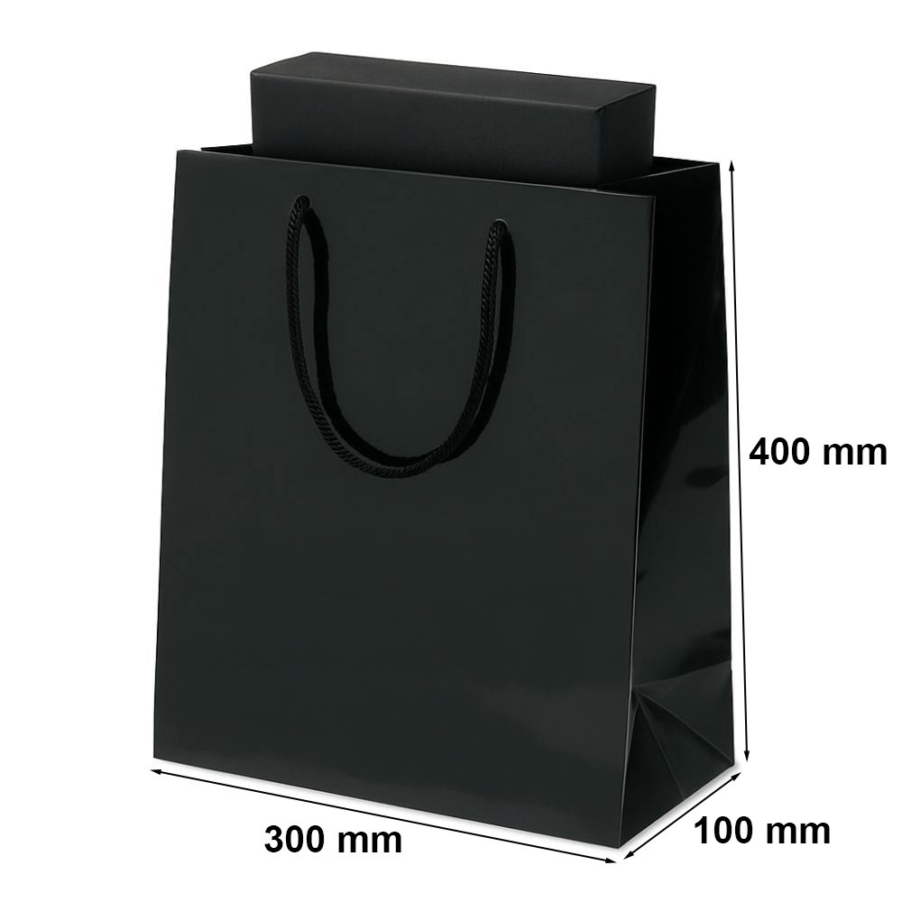 - Czarny kolor torby prezentowej czyni ją uniwersalną pod kątem okazji oraz osoby, dla której przeznaczony jest upominek.