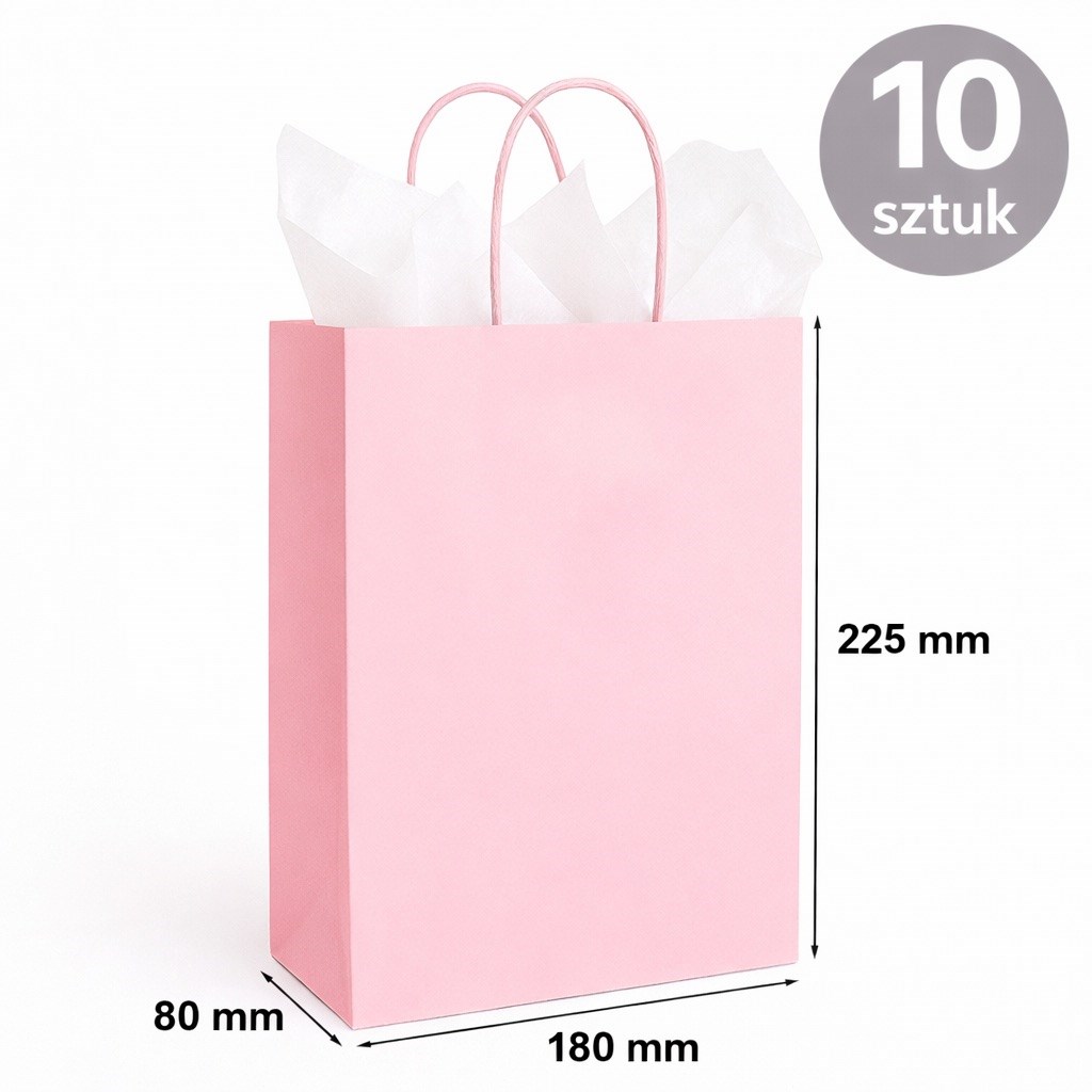 Torba papierowa kraft w kolorze jasny różowy o wymiarach 180×80×225 mm to kompaktowe opakowanie do pakowania produktów w sprzedaży detalicznej.
