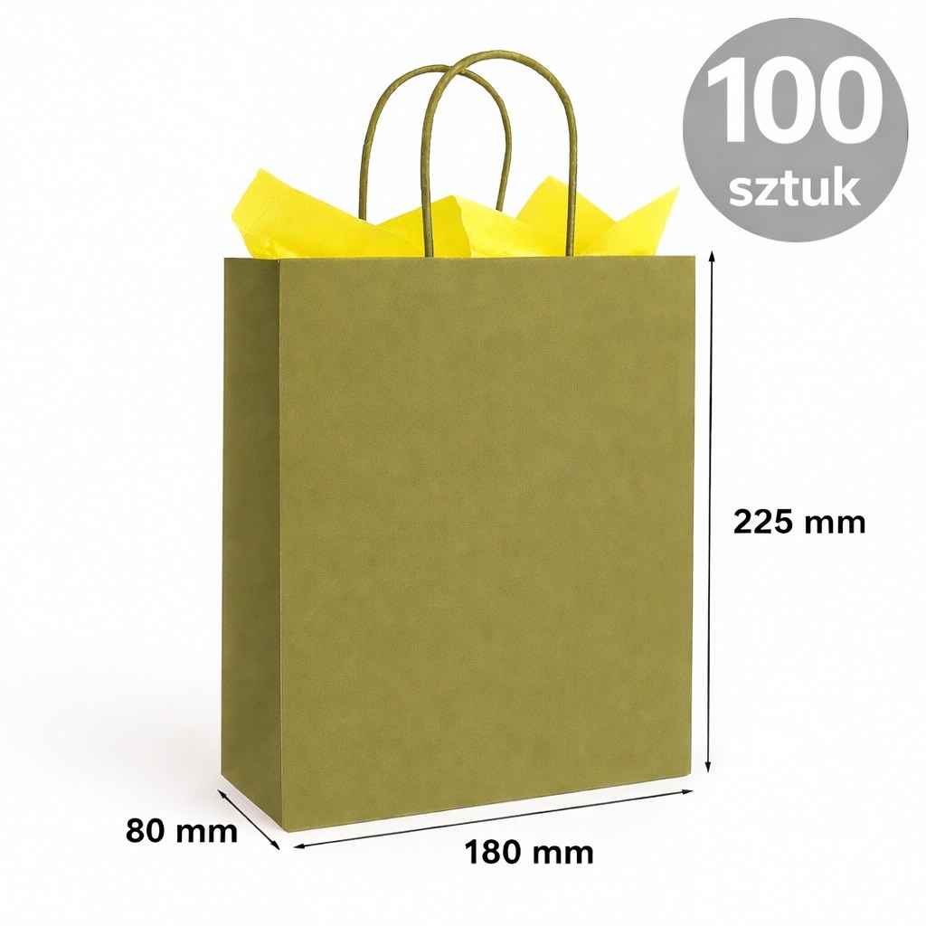 Torba papierowa kraft w kolorze khaki (zielony brudny) o wymiarach 180×80×225 mm to rozwiązanie do pakowania produktów w sprzedaży detalicznej i wysyłkowej.