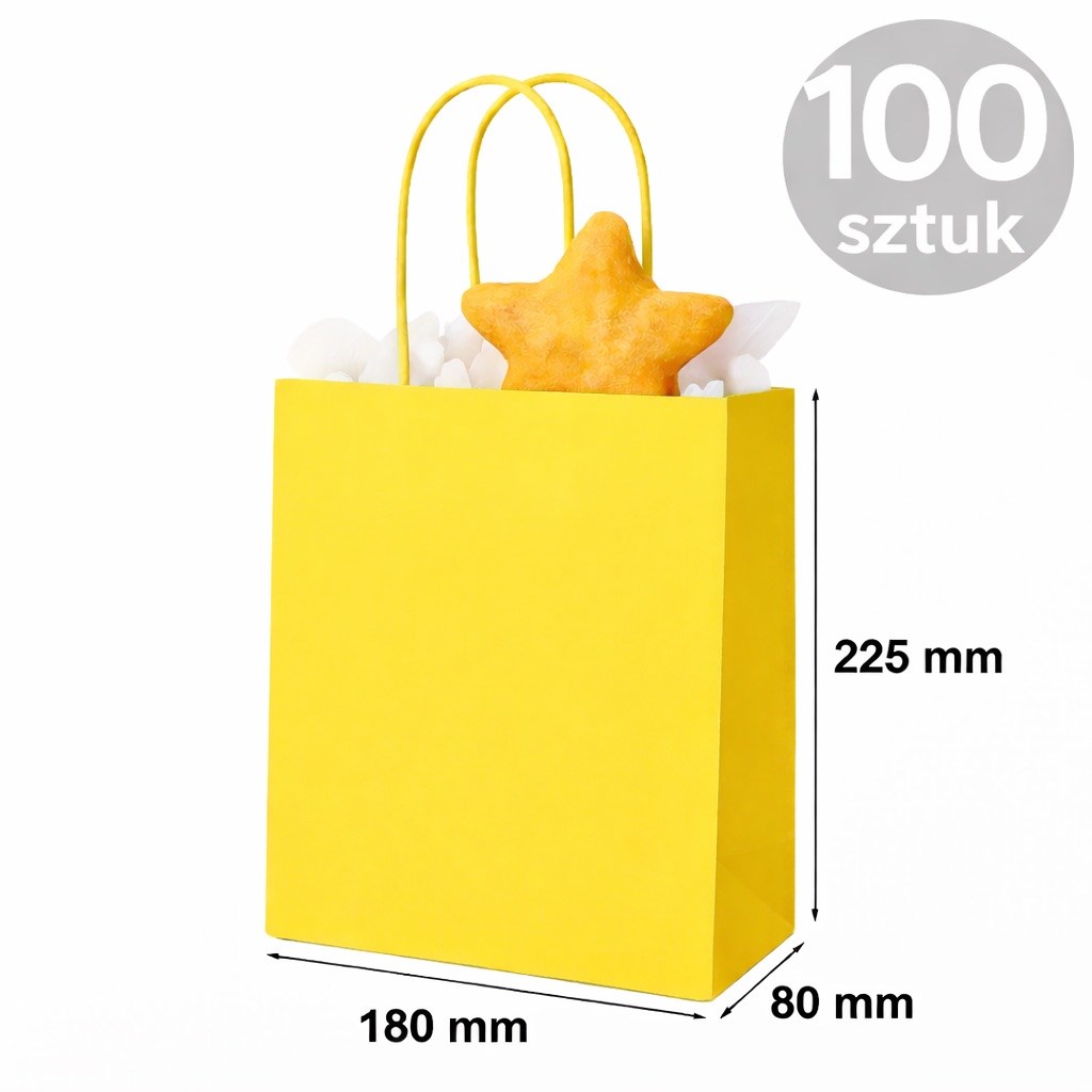 Torba papierowa w kolorze żółtym o wymiarach 180×80×225 mm to opakowanie do pakowania produktów w sprzedaży detalicznej oraz przy realizacji zamówień.