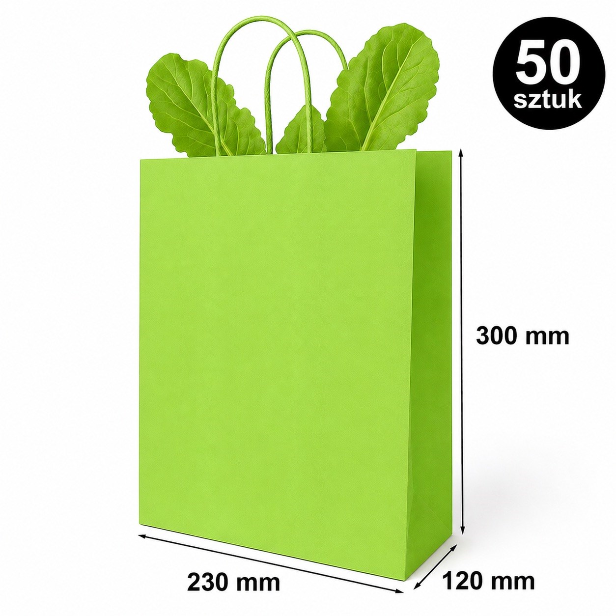 Zestaw 50 sztuk toreb papierowych ozdobnych w kolorze zielonym o wymiarach 230 × 120 × 300 mm przeznaczonych do pakowania prezentów oraz produktów.