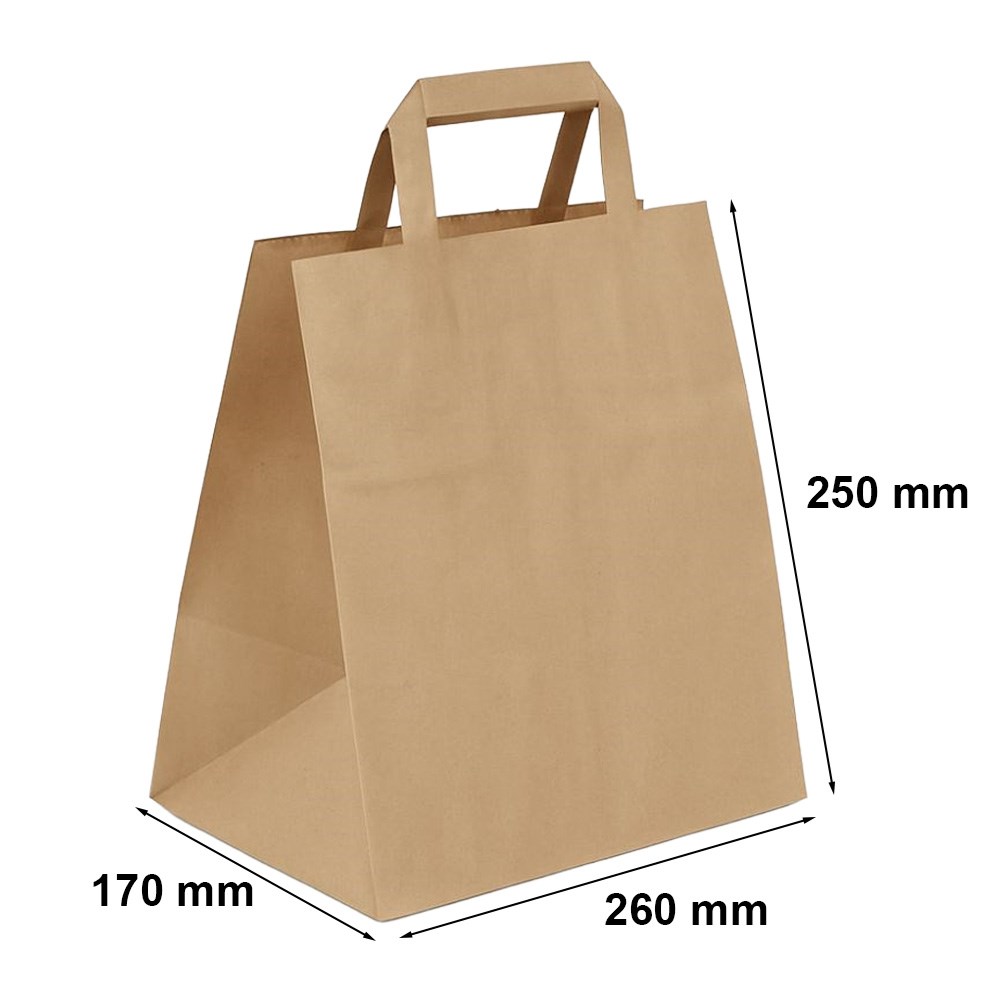 Brązowa torba papierowa w rozmiarze 260x170x250 mm nienagannie się prezentuje. Sprawdzi się podczas pakowania osobistych, a nawet firmowych prezentów. Papierowa struktura pozwala na nadrukowanie lub naklejenie logo firmy, stanowiąc przy tym bardzo skuteczną reklamę. Torba jest zatem nie tylko praktycznym produktem, ale może także w łatwy i niedrogi sposób wypromować naszą firmę. Możliwość wielokrotnego użytku jest dodatkowym atutem papierowych torebek.