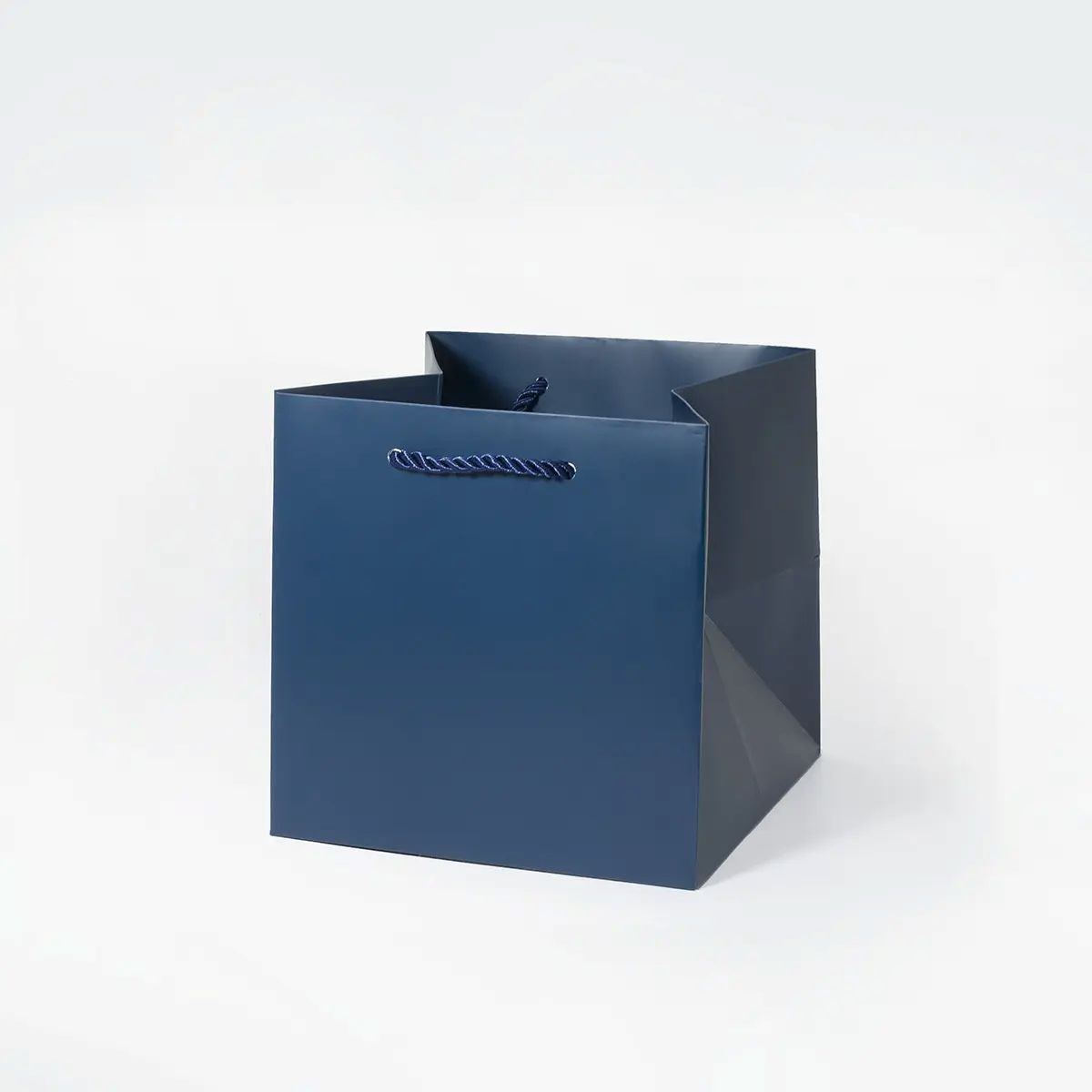 Granatowa torba papierowa o kwadratowym formacie została zaprojektowana do pakowania produktów o większej objętości przy zachowaniu kompaktowych wymiarów. Równe proporcje ułatwiają stabilne ułożenie zawartości i bezpieczne przenoszenie. Sztywna konstrukcja oraz wzmocnione dno pozwalają transportować produkty o średniej wadze bez deformacji. Matowa laminacja typu anti-scratch chroni powierzchnię przed zarysowaniami.
