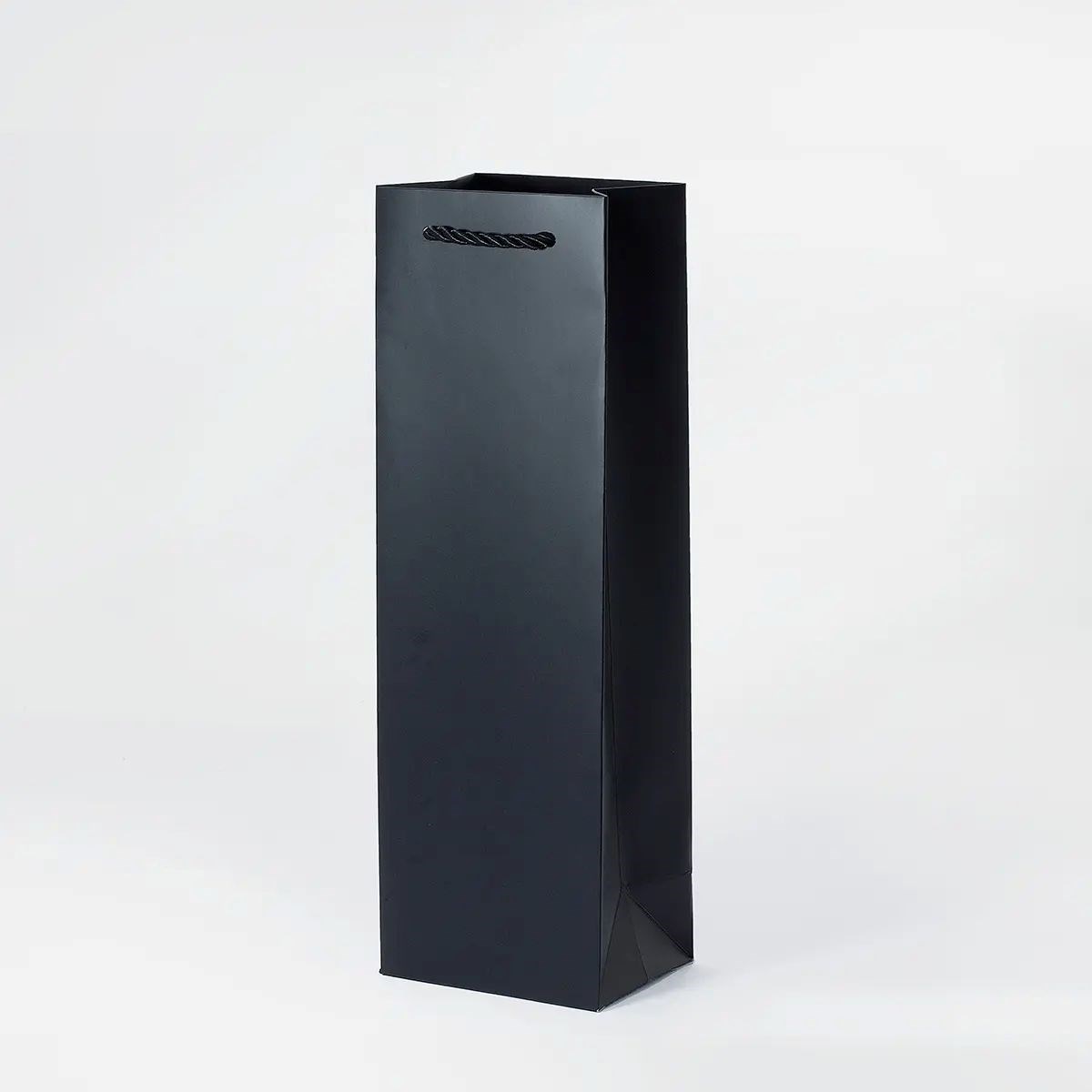 Czarna torba papierowa przeznaczona do pakowania pojedynczej butelki wina lub szampana. Smukła konstrukcja umożliwia stabilne ułożenie butelki i bezpieczne przenoszenie. Sztywne ścianki oraz wzmocnione dno skutecznie podtrzymują cięższą zawartość. Matowa laminacja typu anti-scratch chroni powierzchnię przed zarysowaniami.