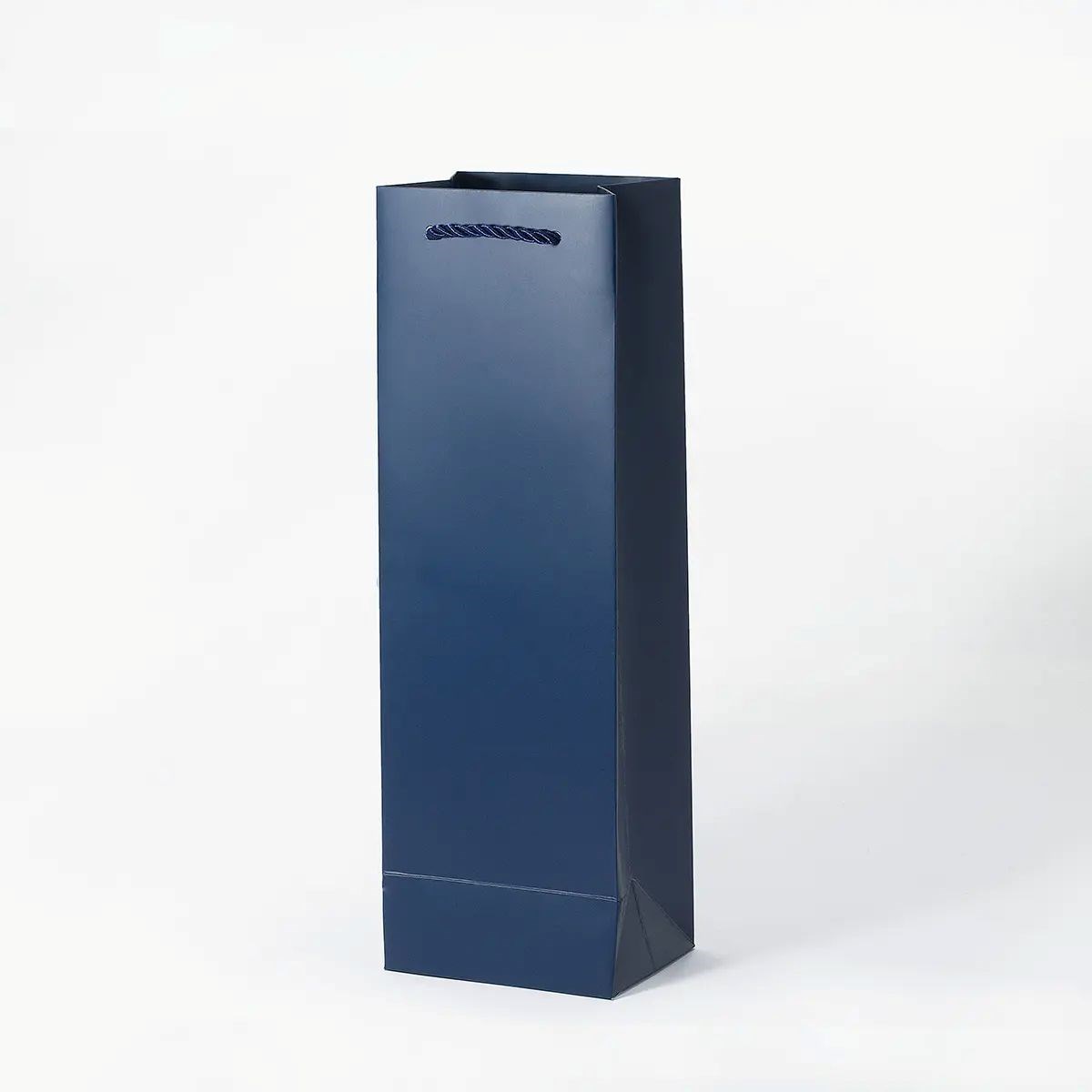 Granatowa torba papierowa została zaprojektowana do bezpiecznego pakowania pojedynczej butelki wina lub szampana. Smukły format ułatwia stabilne ułożenie butelki i wygodne przenoszenie. Sztywna konstrukcja oraz wzmocnione dno skutecznie podtrzymują cięższą zawartość. Matowa laminacja typu anti-scratch chroni powierzchnię przed zarysowaniami.