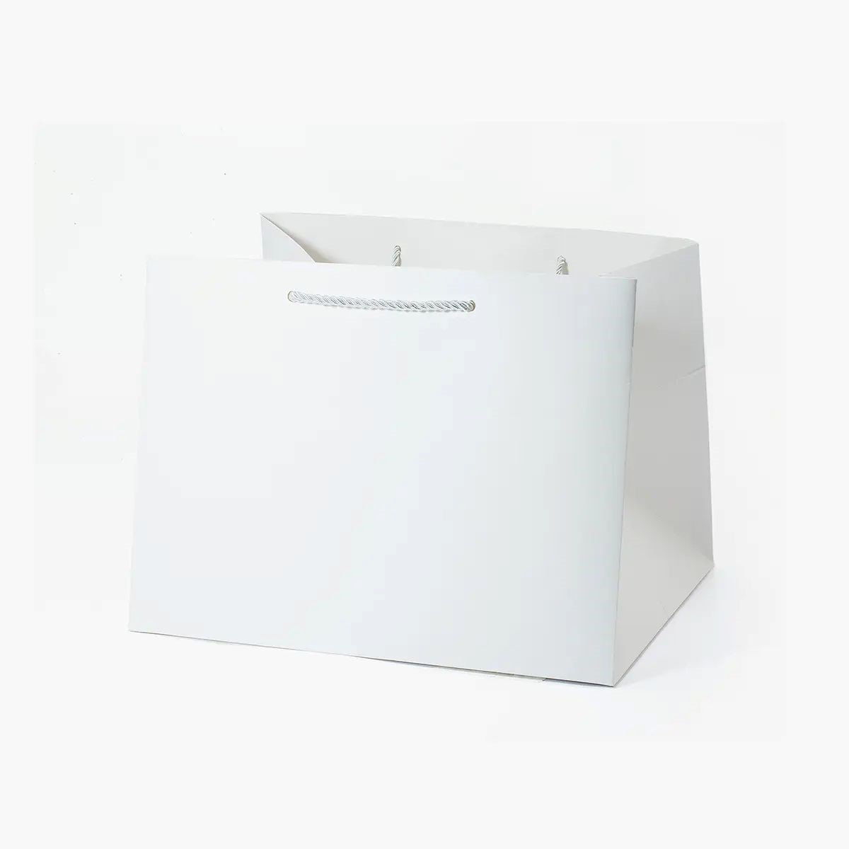 Biała torba papierowa laminowana została zaprojektowana do pakowania produktów o większej objętości i wadze. Zwiększona wysokość oraz wzmocnione dno umożliwiają bezpieczne przenoszenie odzieży, dużych prezentów lub kilku produktów jednocześnie. Sztywna konstrukcja zachowuje stabilną formę nawet przy pełnym obciążeniu. Srebrne, skręcane uchwyty zapewniają wygodę podczas transportu.