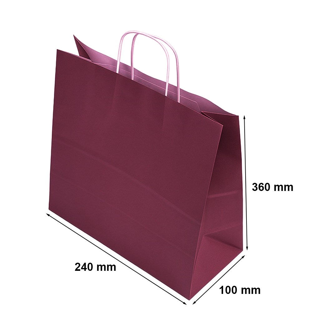 Torba papierową w kolorze bordowym została wykonana z biodegradowalnych surowców naturalnych. Uchwyt został wykonany z papierowego sznurka, który jest ekologiczny i dodatkowo wytrzymały na duże obciążenie. Umożliwia wygodne trzymanie torby. Oba te materiały świadczą, że akcesorium nie zagraża środowisku. Daje to gwarancję, wygodnych zakupów przy dbaniu o środowisko naturalne. Dno torby ma formę klockową, dlatego wygodnie pakuje się do niej każdy przedmiot. Forma ta nie odkształca się pod wpływem nacisku. Dokładne wymiary to 240 x 100 x 320 mm. Torby papierowe są wielorazowego użytku. Tobę należy przechowywać w suchym miejscu w domu, gdzie nie ma dostępu do wilgoci. Oferta zawiera jedną torbę. Na Naszej stronie Neopak znajdziesz również papierowe torby w innych kolorach. Torba może różnić się nasyceniem koloru, od tego przedstawionego n zdjęciu.