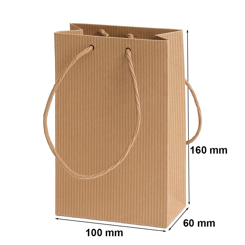 - Torebka o wymiarach 100x60x160 mm została wykonana z wytrzymałej tektury falistej. Dzięki temu to lekkie, a zarazem stabilne opakowanie.