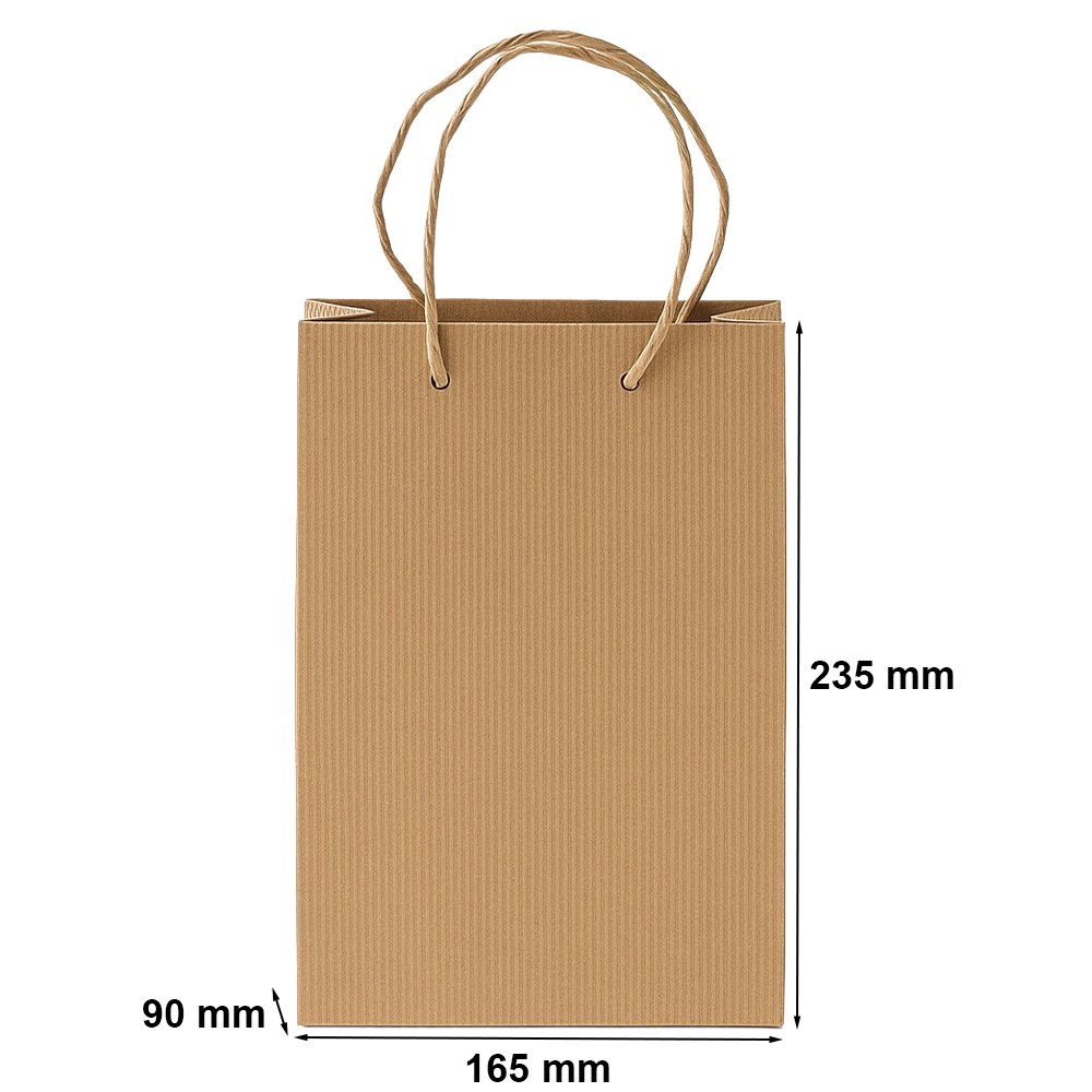 Tekturowa torebka o wymiarach 165x90x235 mm z uchwytem w postaci papierowego sznurka. W całości biodegradowalne opakowanie, które stanowi ekologiczną alternatywę dla wielu opakowań prezentowych. Wykonana z tektury falistej torebka w naturalnym brązowym kolorze nadaje się do zapakowania prezentów z takich okazji, jak urodziny, ślub czy święta. Elegancka, estetyczna prezentowa torba bez żadnych wzorów stanowi uniwersalne rozwiązanie i może być użyta wielokrotnie.