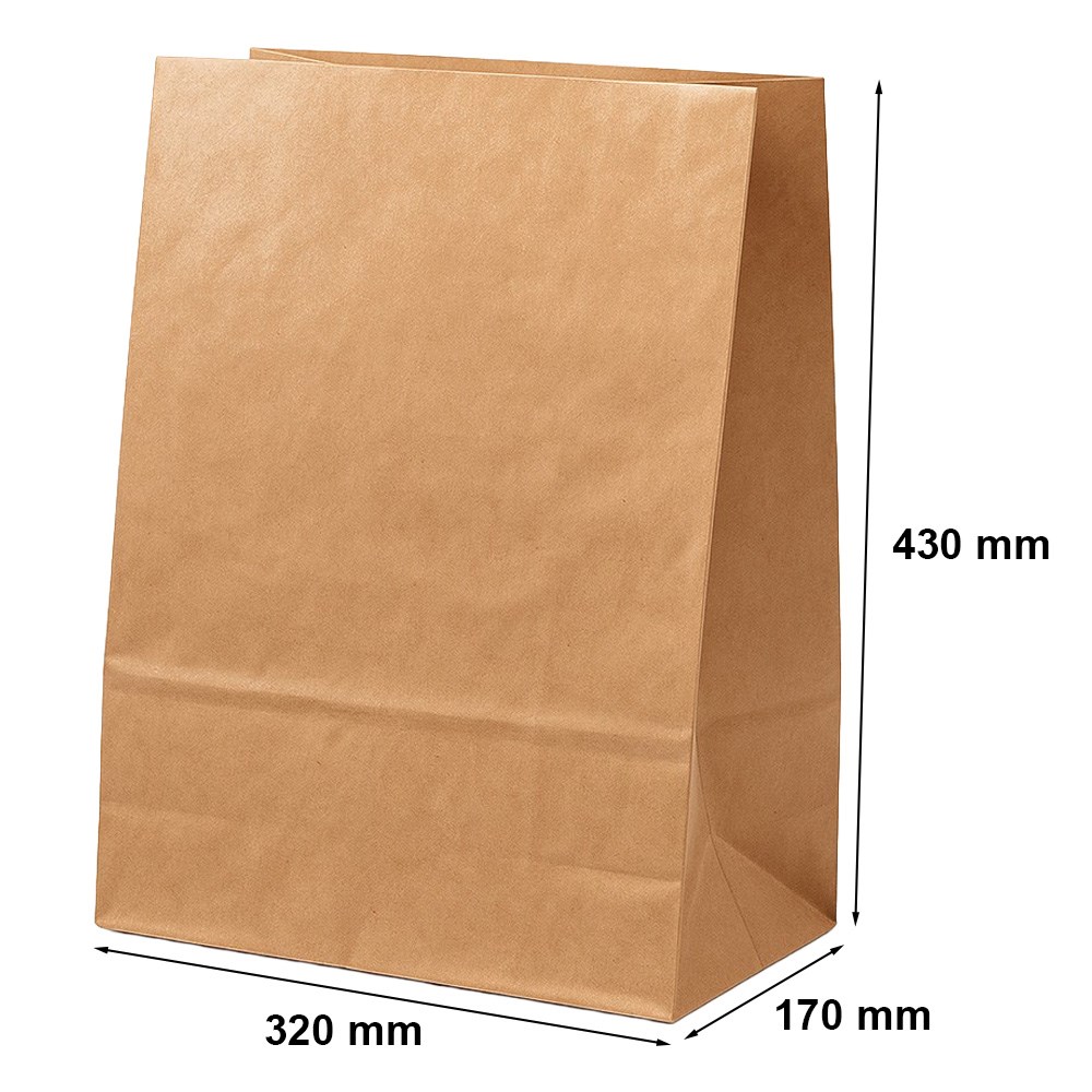 Brązowe torby papierowe dostępne w naszym sklepie w rozmiarze 320 x 170 x 430 mm nadają się do wykorzystania podczas zakupów czy w trakcie transportu paczek o średnim, a także większym obciążeniu.