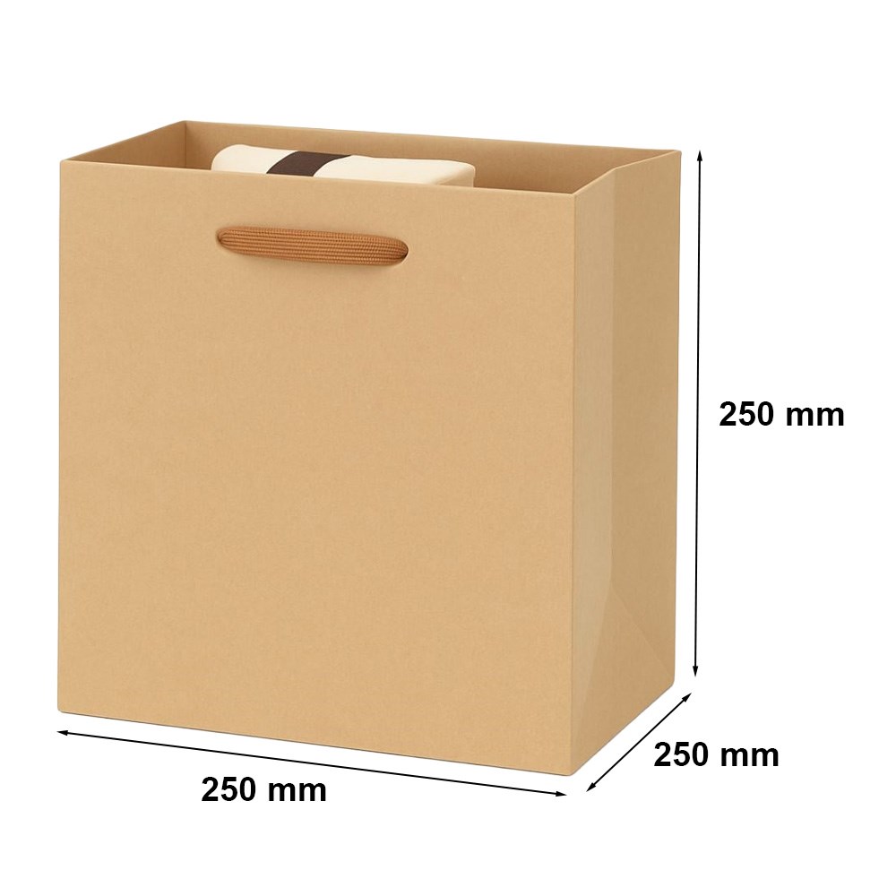 Oferowana papierowa torba to produkt o wymiarach 25 x 25 x 25 cm. Torby te są wysoce trwałe i doskonale nadają się jako estetyczne opakowania na podarunki. Minimalistyczny format torebki sprawia, że świetnie dopasowuje się ona do każdej okoliczności. Zastosowany do produkcji papier ma gramaturę wynoszącą 210 g/m2. To sprawia, że wszystkie ściany torby nie ponoszą typowych uszkodzeń i przez długi czas prezentują się świeżo i estetycznie.