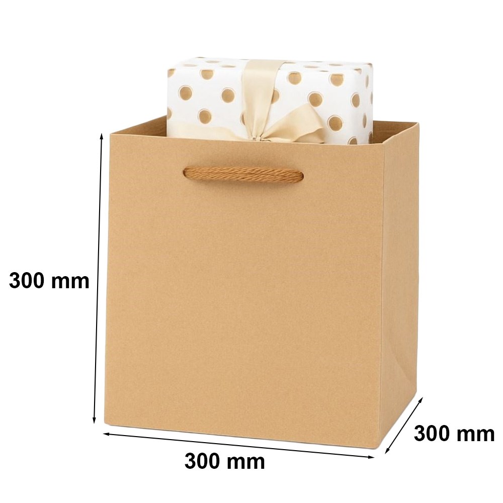 Dostępna w ofercie naszego sklepu papierowa torba, ma naturalny jasny brązowy kolor. Jej wymiary wynoszące 30 x 30 x 30 cm, pozwalają na zapakowanie mniejszych i większych podarunków. Torebka o kwadratowym formacie posiada wzmocnione dno klockowe, które gwarantuje bezpieczniejszy transport spakowanych przedmiotów. Dno klockowe jest konstrukcją, która lepiej rozkłada osadzony ciężar i zapobiega rozerwaniu się dna torebki.