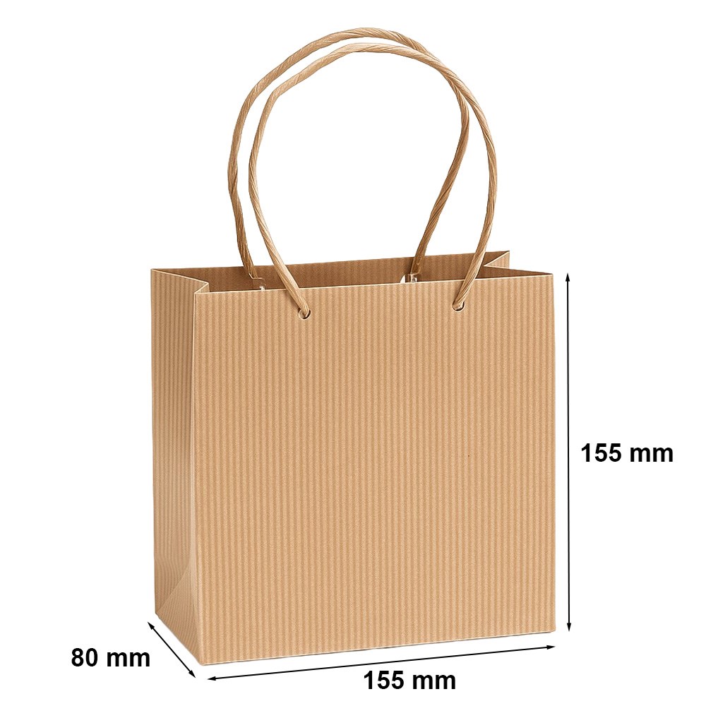 Oferowany przez nas produkt to torba prezentowa o wymiarach 155x80x155 mm. Jednokolorowe opakowanie prezentowe nadają się do wręczania prezentów z wielu okazji. Mała torebka tekturowa sprawdzi się znakomicie do wręczania firmowych upominków i gadżetów kontrahentom i klientom. Wykonana z falistej tektury torebka posiada wygodny uchwyt w postaci skręcanego sznurka papierowego. W ten sposób cała torebka to ekologiczny produkt, który jest biodegradowalny i może być użyty wielokrotnie. Estetyczne, eleganckie opakowanie prezentowe bez zdobień i wzorków. Swoim wyglądem torebka nawiązuje do natury i stylu boho. Będzie stanowiła idealne opakowanie na prezenty dla gości weselnych.