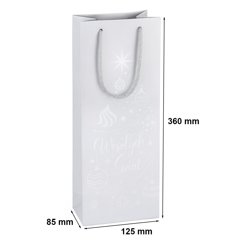 Torebka na wino 125 × 85 × 360 mm K-421 CHS – srebrna z białym nadrukiem „Wesołych Świąt”