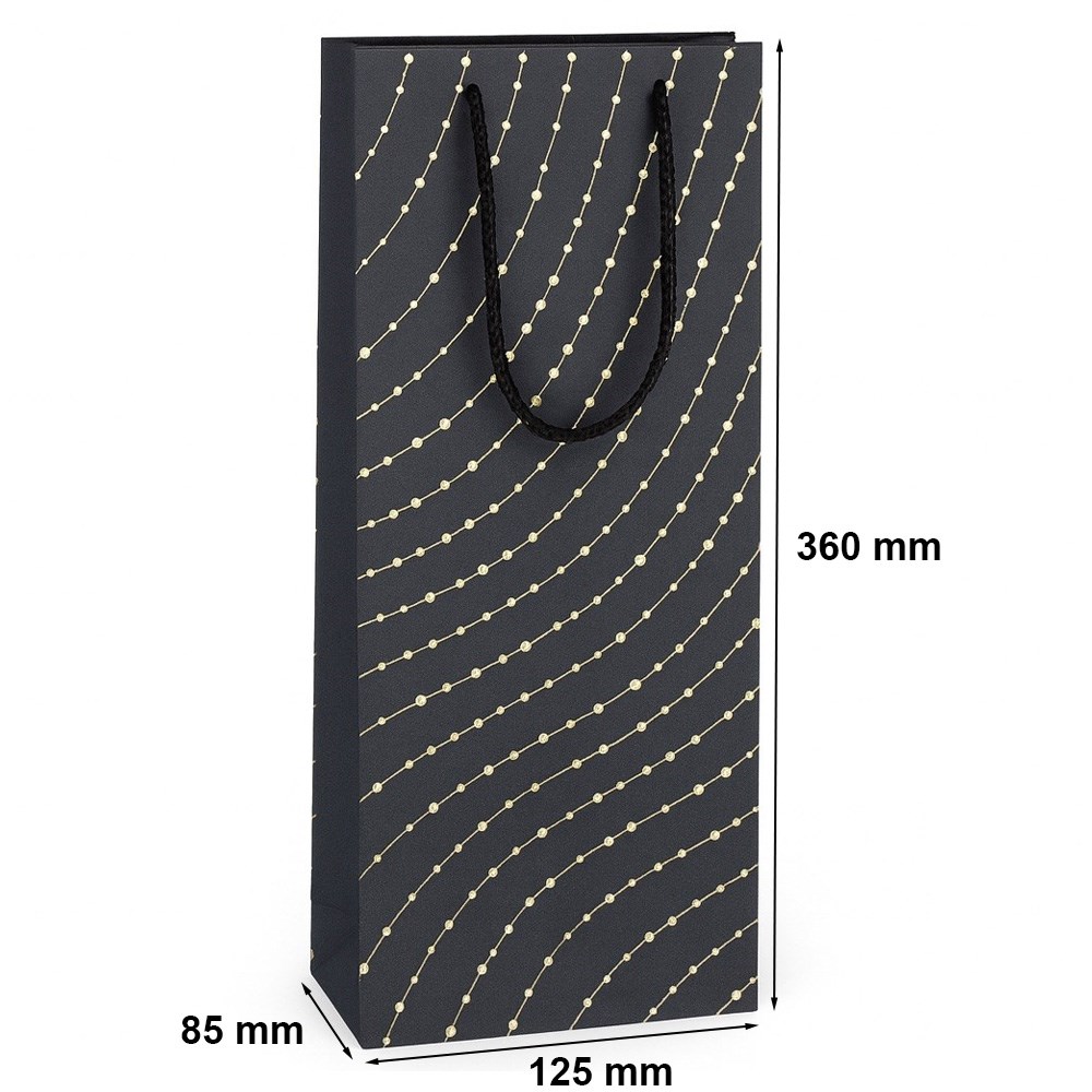 Torebka prezentowa na wino w eleganckim czarnym kolorze z złotymi zdobieniami to stylowe i praktyczne opakowanie na butelki. Wykonana z mocnego papieru, posiada czarne uchwyty, które zapewniają komfortowe i bezpieczne przenoszenie.