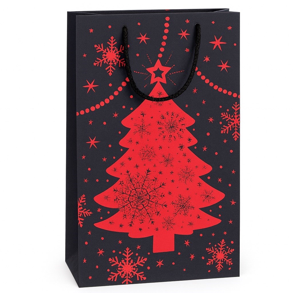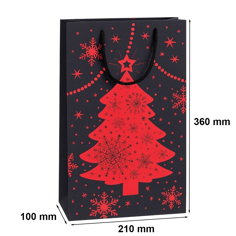 Torebka prezentowa na wino w eleganckim czarnym kolorze z motywem czerwonej choinki i śnieżynek to praktyczne i efektowne rozwiązanie do pakowania butelek w okresie świątecznym. Wykonana z mocnego papieru, posiada czarne uchwyty zapewniające komfort i bezpieczeństwo użytkowania.
