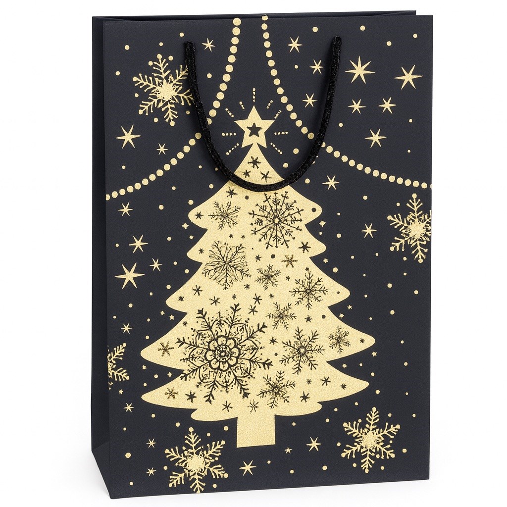 Torebka prezentowa na wino w eleganckim czarnym kolorze z motywem złotej choinki i śnieżynek to praktyczne rozwiązanie do pakowania butelek. Wykonana z wytrzymałego papieru, posiada czarne uchwyty zapewniające komfortowe i bezpieczne przenoszenie.