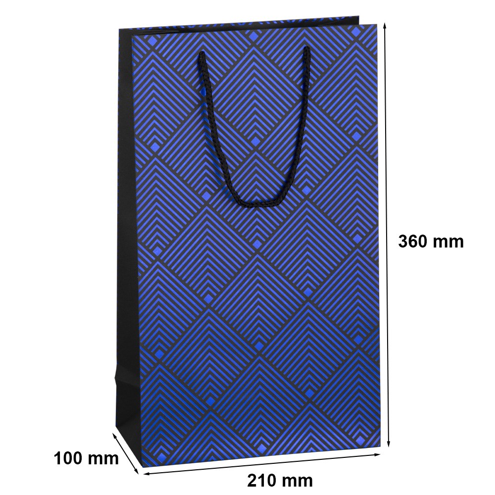 Elegancka torebka upominkowa, która swoimi wymiarami dopasowana jest do większości butelek z alkoholem. Dzięki temu może stanowić znakomite opakowanie prezentowe dla butelki wina lub whisky. Uniwersalny wzór opakowania sprawia, że może być wręczona w ramach prezentu na każdą okoliczność. Sprawdzi się jako torebka prezentowa na prezent wręczany z okazji urodzin, jubileuszu ślubu, świąt czy obronienia licencjatu. Torebka posiada wygodny, mocny uchwyt w postaci plecionego sznurka. Klockowy rodzaj dna jest wytrzymały i zapewnia dobrą ochronę nawet dla ciężkiej zawartości torebki.