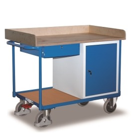 W modułowej budowie wózka możemy wyróżnić szafkę z zamknięciem cylindrycznym. Oprócz tego na szczycie znajduje się pojemna płyta robocza wykonana ze sklejki, która z trzech stron ma dodane zabezpieczające ranty.