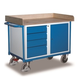 Warsztatowy wózek gospodarczy z szufladami oraz szafką, które posiadają zamknięcie na zamek cylindryczny. To pozwala na bezpieczne przechowywanie cennych przedmiotów prywatnych lub narzędzi w warsztacie, gdzie pracuje wiele osób.