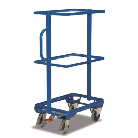 Wózek transportowy z półkami bez płyty. Górna i średnia półka z ładownością do 50 kg. Półki posiadają krawędź o wysokości 10mm, która przytrzymuje ustawione skrzynki na miejscu. Wózek wyposażony w cztery koła z łożyskami kulkowymi i osłoną przeciwwłókienną, w tym dwa koła obrotowe z hamulcem EASY-stop (koła blokują się przy jednym naciśnięciu hamulca).